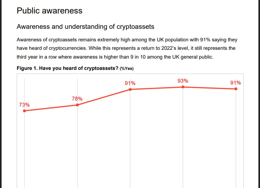 Thời gian khảo sát cho nghiên cứu của FCA diễn ra từ ngày 5 tháng 8 đến ngày 2 tháng 9 năm 2025, sử dụng bảng khảo sát trực tuyến YouGov để thu thập mẫu đại diện toàn quốc gồm 2.353 cuộc phỏng vấn cùng với một mẫu tăng cường những người sở hữu hoặc đã từng sở hữu tiền điện tử. Nhận thức về tiền điện tử vẫn cao ở mức 91%, mặc dù số người báo cáo sở hữu chúng đã giảm.