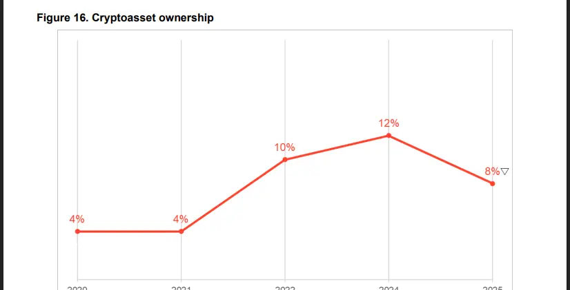 Theo nghiên cứu mới được ủy quyền bởi Cơ quan Quản lý Tài chính, tỷ lệ người trưởng thành tại Vương quốc Anh sở hữu tiền điện tử đã giảm xuống còn 8% vào năm 2025, giảm so với 12% một năm trước đó.