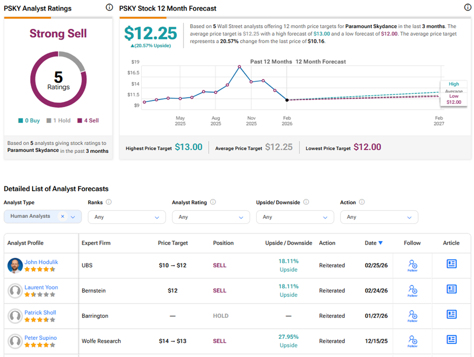 Trên TipRanks, PSKY nhận được xếp hạng Bán mạnh dựa trên không có Mua nào, một Giữ và bốn Bán. Mục tiêu giá trung bình của Paramount Skydance là 12,25 USD, dự báo tiềm năng tăng 20,6% so với mức hiện tại. Trong năm qua, cổ phiếu PSKY đã giảm 9,5%.