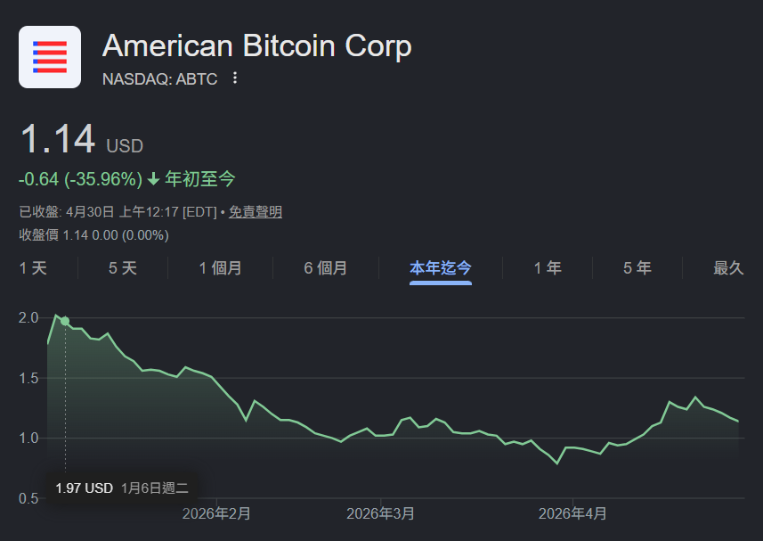 Trong khi đó, kể từ khi niêm yết vào tháng 9 năm 2025, cổ phiếu của American Bitcoin đã giảm mạnh 85%, và đóng cửa vào thứ Tư theo giờ Mỹ ở mức 1,14 USD, giảm khoảng 36% từ đầu năm đến nay.