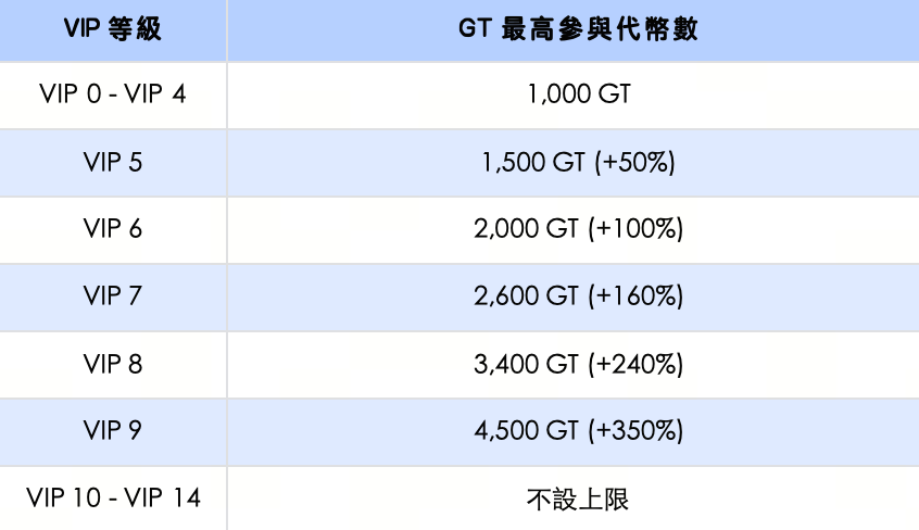 完成身分認證;GT 持倉 ≥ 1 GT,可按照 GT 持倉快照量佔比瓜分總獎池。每位 VIP 0 - VIP 4 用戶本次活動參與上限為 1,000 GT,VIP 10 及以上用戶最高可享【不設上限】的參與額度。