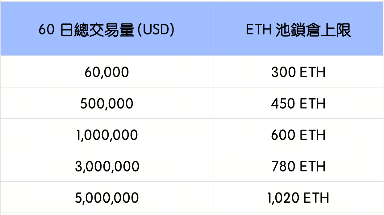 將根據 60 日總交易量確定鎖倉上限。達到更高的交易量,即可解鎖更高的質押額度。