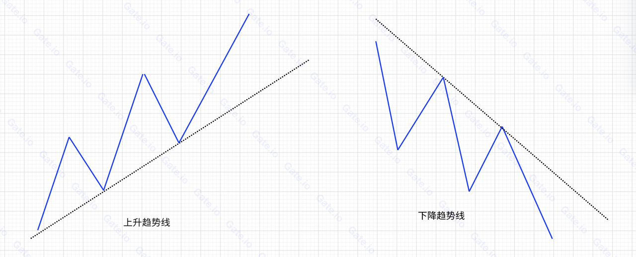 根據趨勢線方向的不同,可以分爲上升趨勢線和下降趨勢線。如下圖所示: