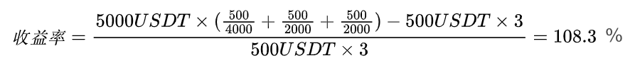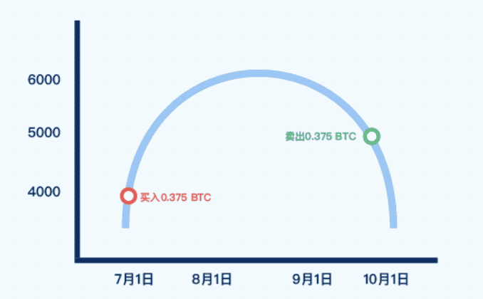 如果在 7 月 1 日,小美同樣投入1500 USDT,通過幣幣交易直接一次性購得 0.375 BTC(7 月 1日 BTC 價格爲 4000 USDT)。三個月後,他以 5000 USDT 的價格將所持有的 BTC 全部賣出,收益率只有 25%。