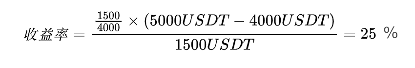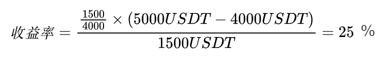 如果在 7 月 1 日,小美同樣投入 1500 USDT,通過幣幣交易直接一次性購得 0.375 BTC(7月1日 BTC 價格爲 4000 USDT)。三個月後,他以 5000 USDT 的價格將所持有的 BTC 全部賣出,收益率仍有 25%。