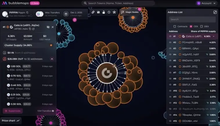 根據BubbleMaps的數據,50個相關聯的錢包幾乎在同一時刻通過買單共計吸納了1,900萬美元的PIPPIN。