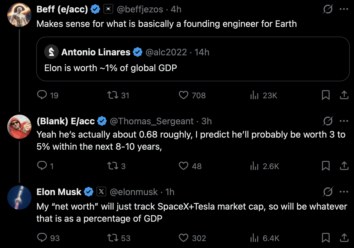 他說的是:「My ‘net worth’ will just track SpaceX+Tesla market cap, so will be whatever that is as a percentage of GDP.」(我的淨資產只會跟著 SpaceX 和特斯拉市值走,不管它佔 GDP 多少百分比就是多少。)