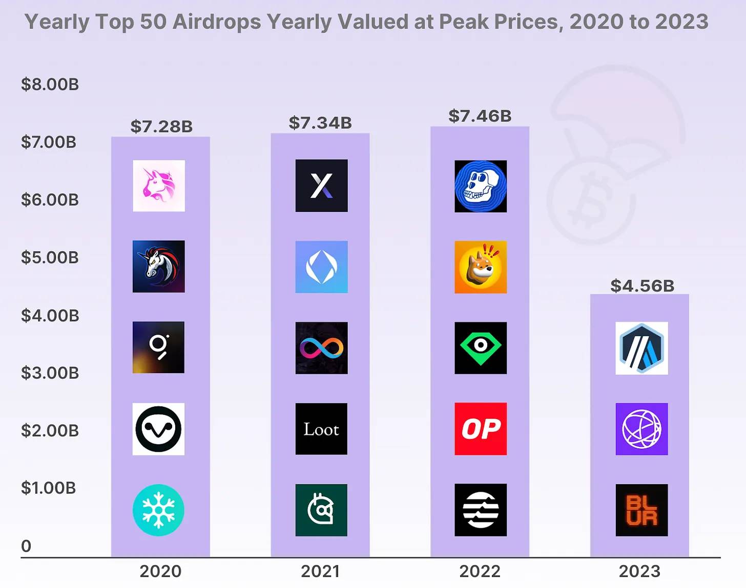 根據 CoinGecko 的統計數據,前 50 大空投的總金額高達 260 億美元。