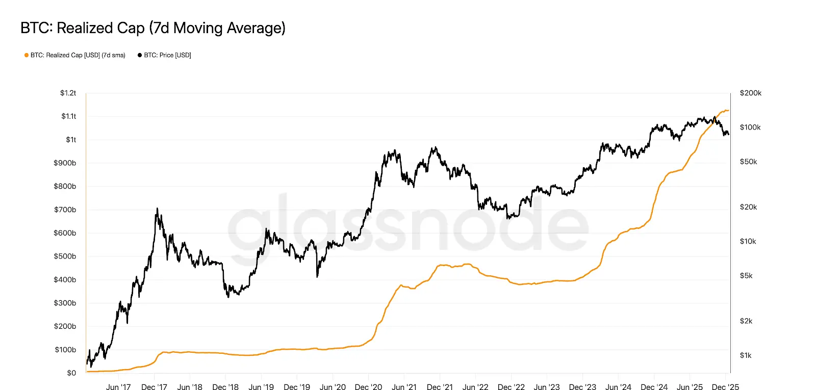 儘管價格波動和ETF資金流動不一,比特幣的長期前景仍然堅實。其實現市值,衡量上一次交易時的幣值,達到創紀錄的1.125兆美元,顯示資金持續流入。