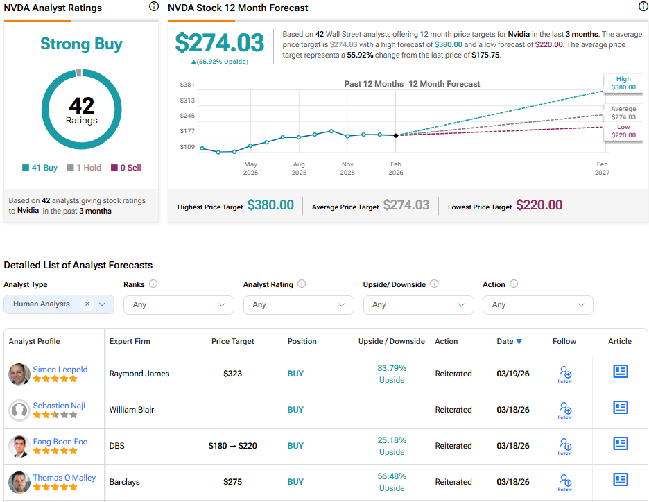 根據華爾街分析師的共識評級,英偉達股票獲得「強烈買入」(Strong Buy),在過去三個月內有41個買入、1個持有、0個賣出,詳見下圖。此外,平均目標價為每股274.03美元,意味著有56%的上行潛力。