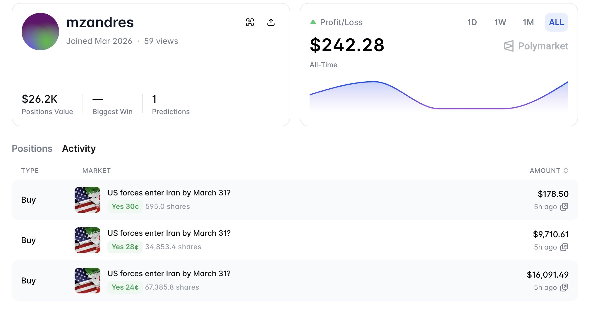 A newly created wallet invested $26,000 predicting that the US military will enter Iran before March 31st.