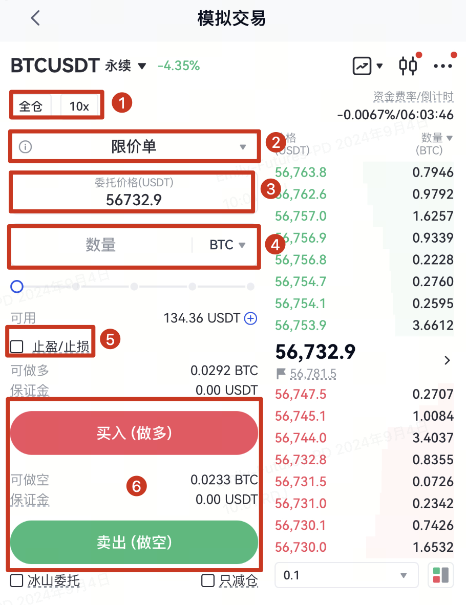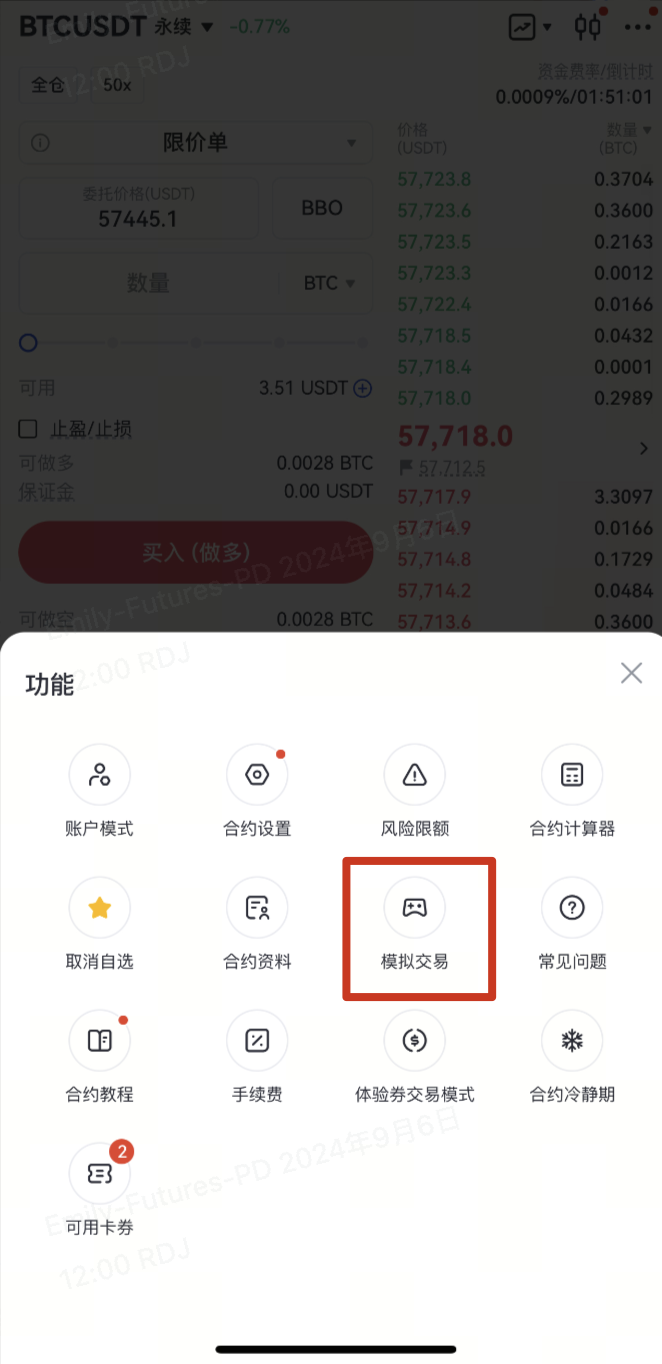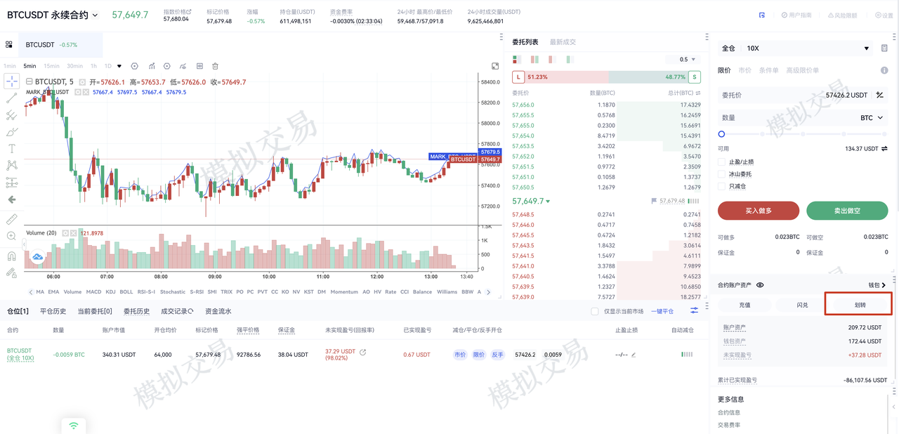 用户可以使用模拟交易体验永续合约的交易功能,其交易页面以及操作方式同实盘交易一致。
