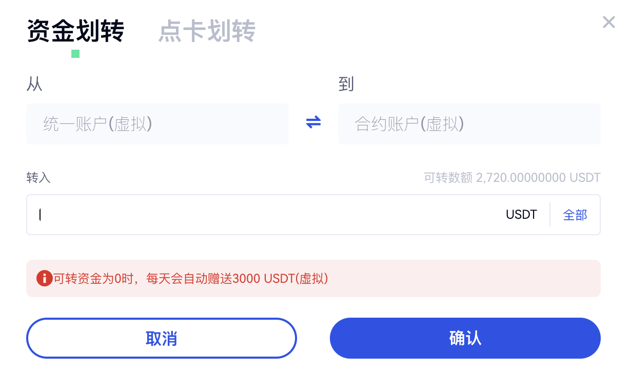 通过点击合约交易界面内“资金划转”的图标,进入二级页面,将虚拟USDT划转至模拟合约资产账户。