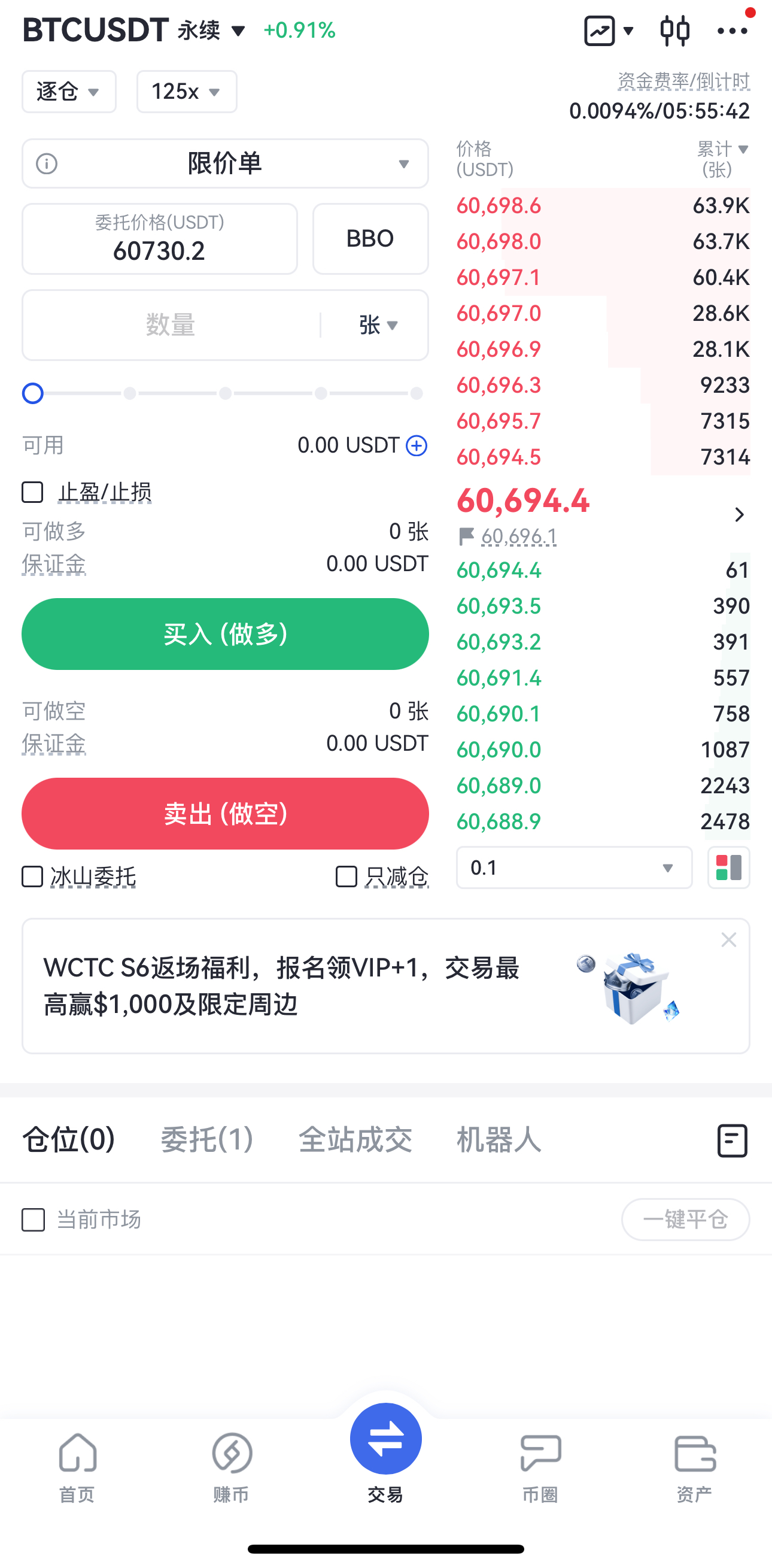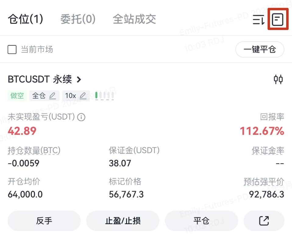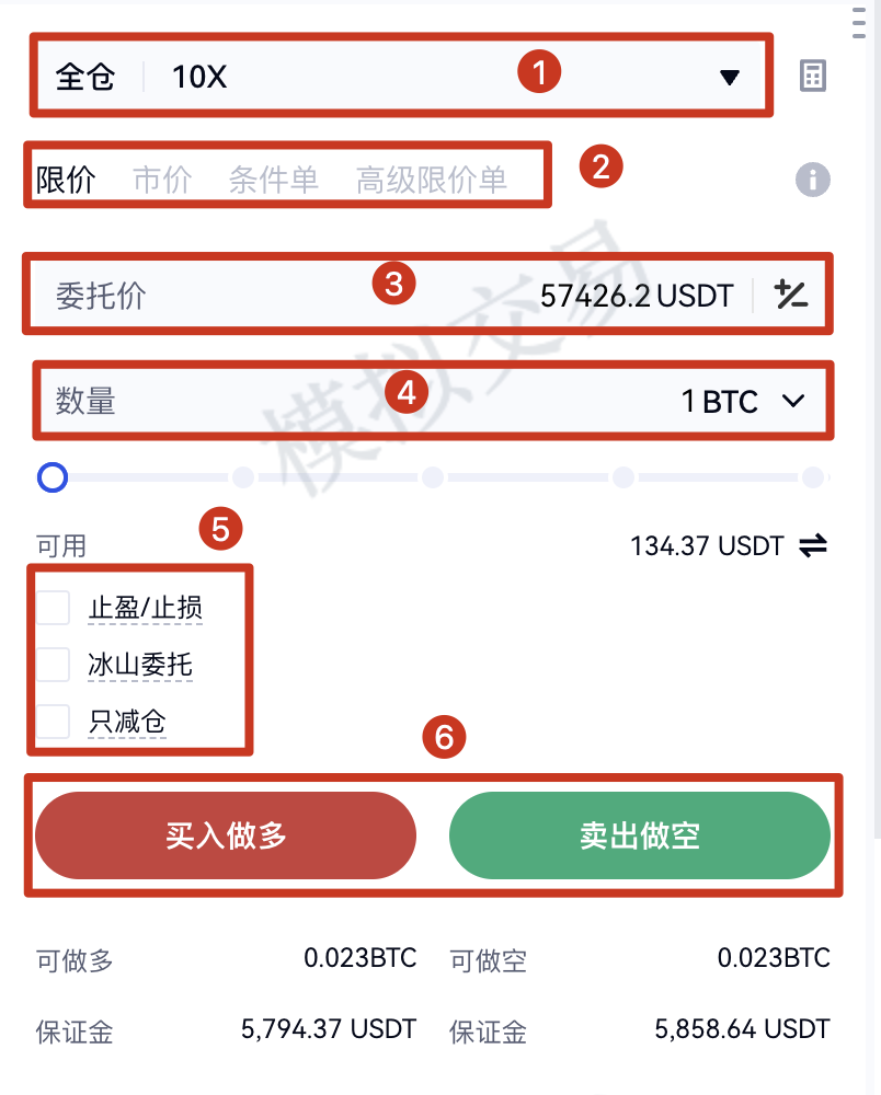 (1)点击选择全仓/逐仓模式和杠杆倍数;