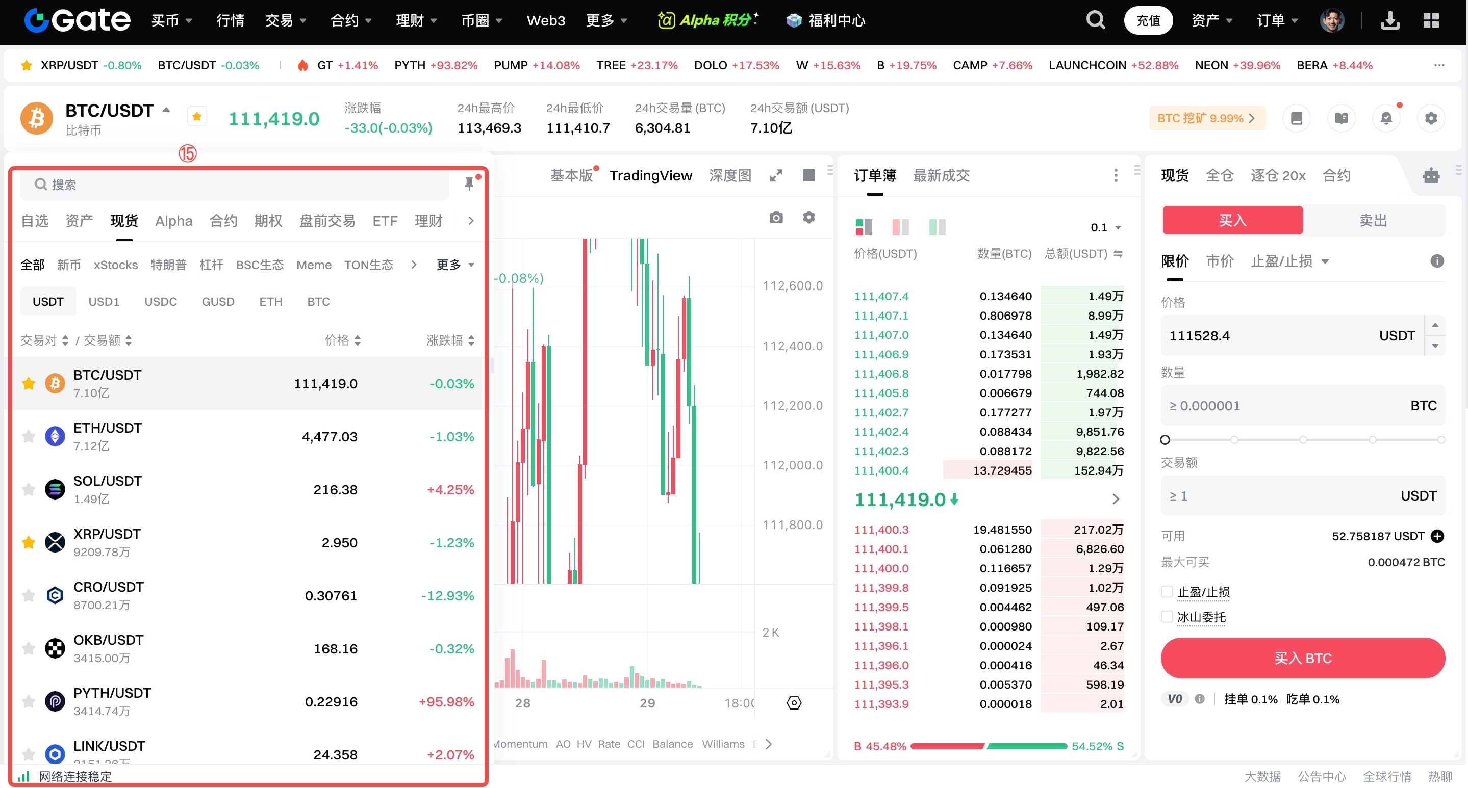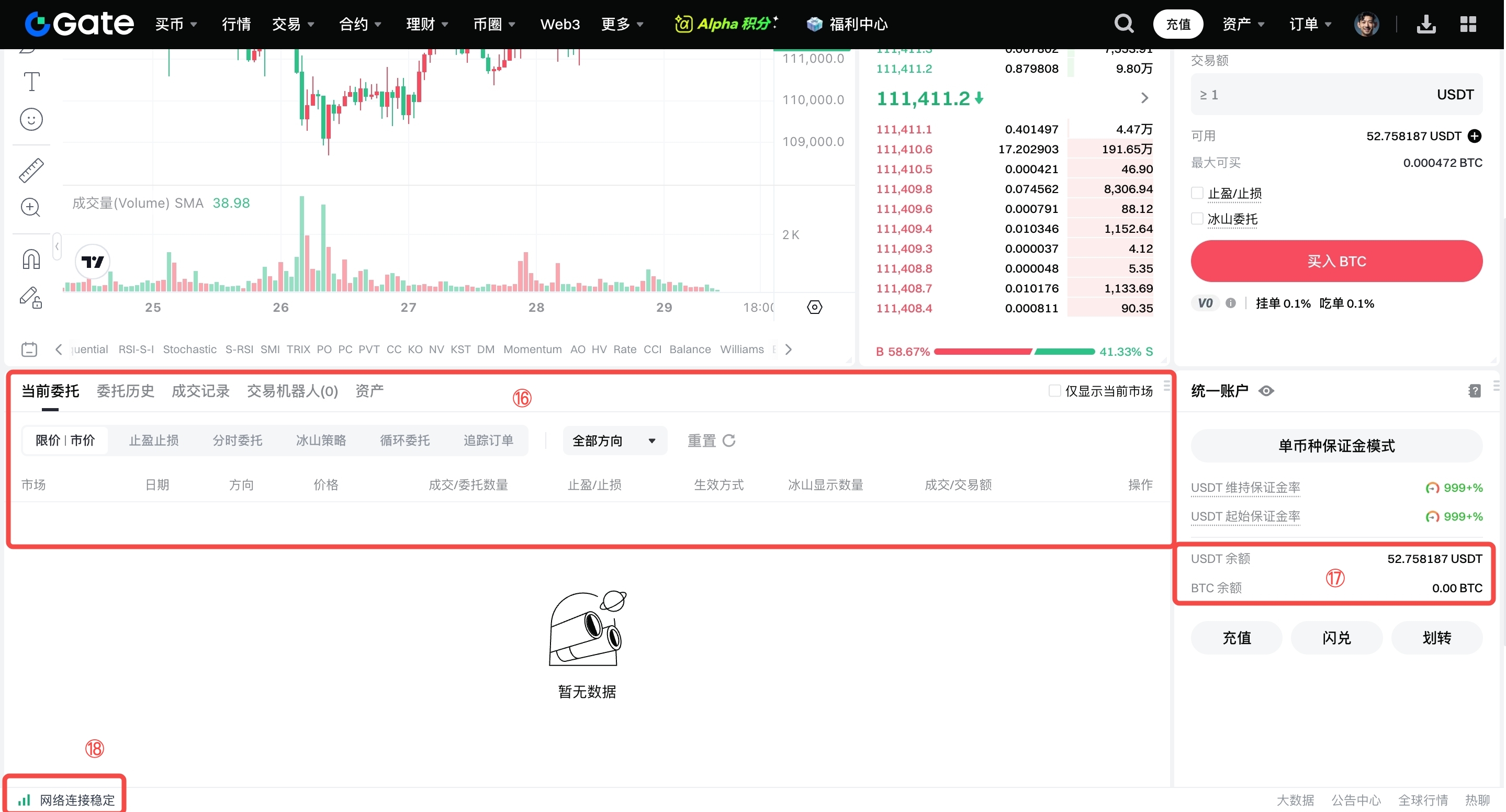 ⑯ 订单区:包括【当前委托】、【委托历史】、【成交记录】和【交易机器人】四块订单,可查看详细的订单信息;