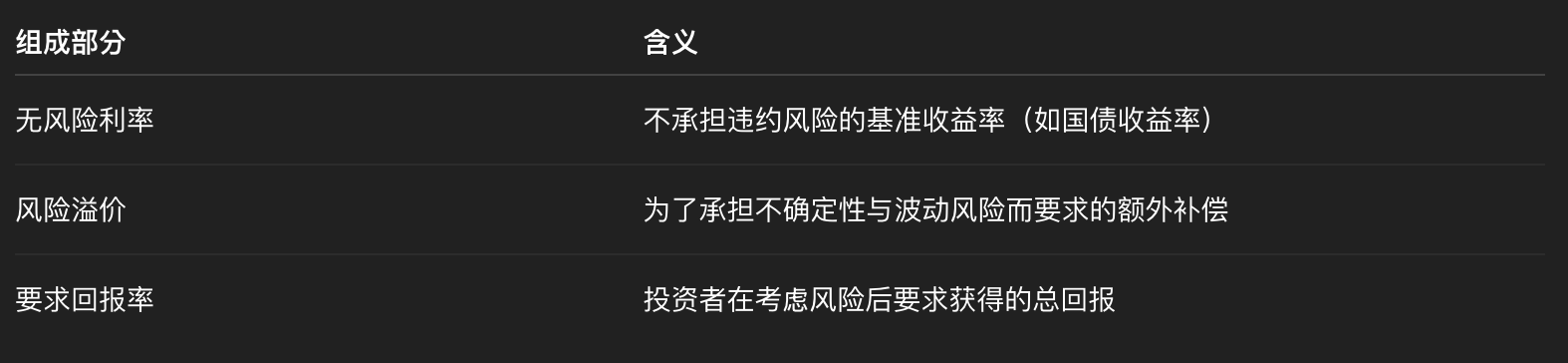 在金融市场中,投资者不会无偿承担风险。如果一项投资存在不确定性,它就必须提供额外回报作为补偿,这部分额外回报就是风险溢价(Risk Premium)。