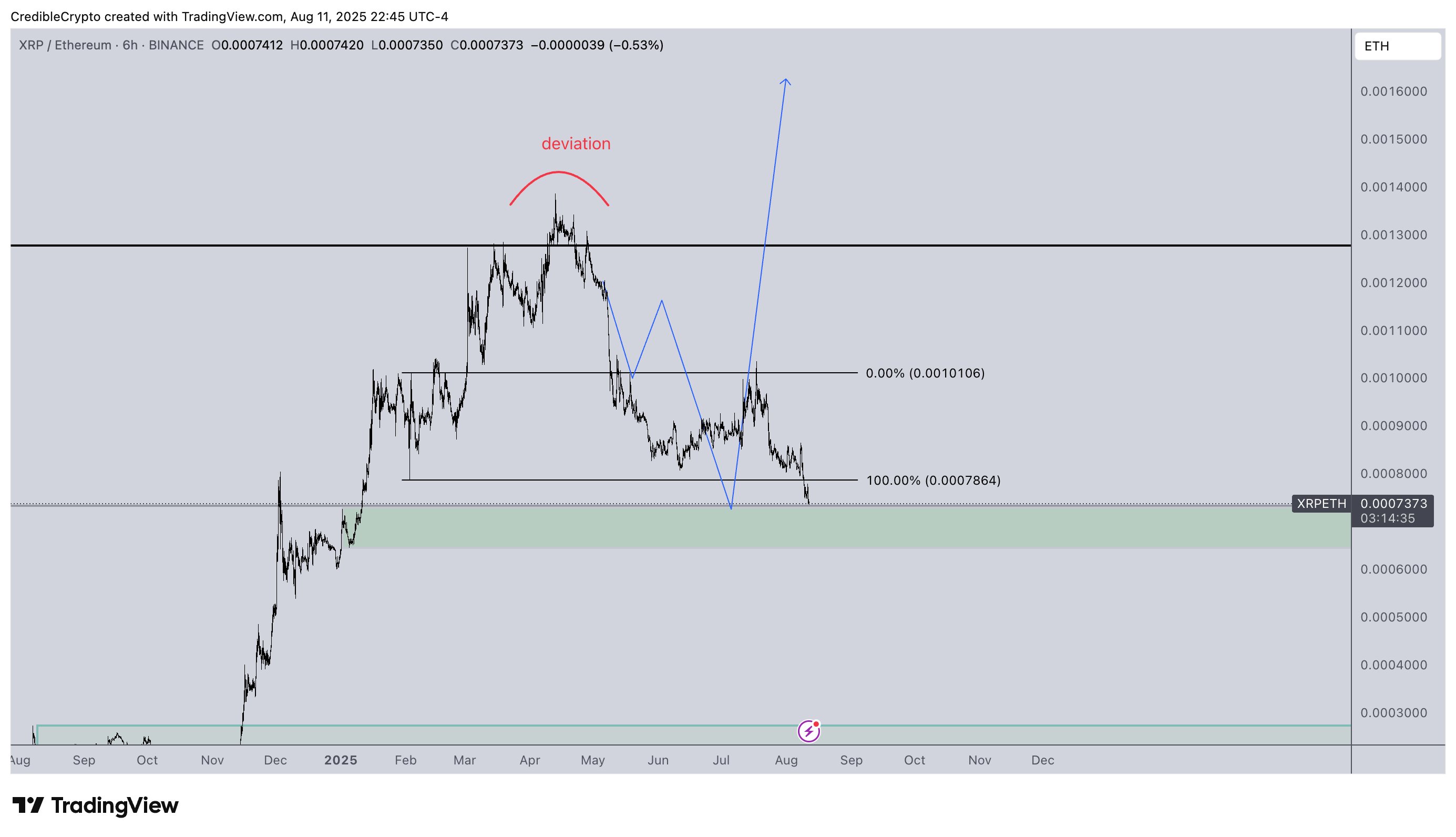 三个月前分享的XRP/ETH的下行目标终于达到了。