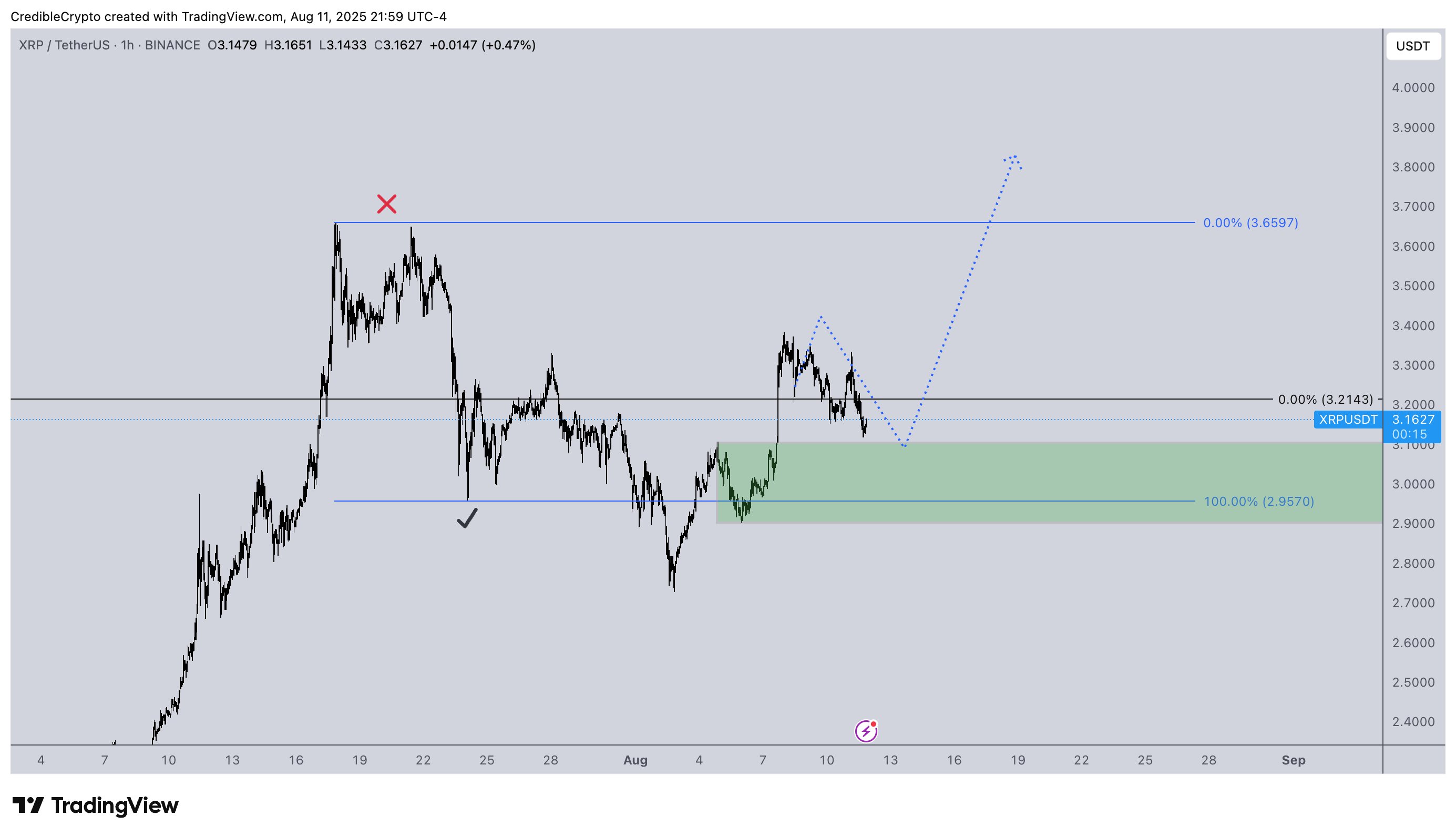 !Image来源:Credible/X在交易员的图表上,他似乎预测XRP将反弹至接近3.90美元。在撰写本文时,XRP 的交易价格为 3.25 美元。