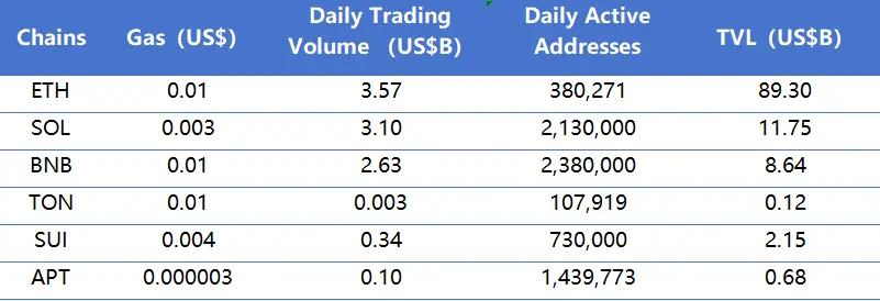 主要从日交易量、日活跃地址、交易费用分析目前主要Layer1含ETH、SOL、BNB、TON、SUI以及APT的相关数据。