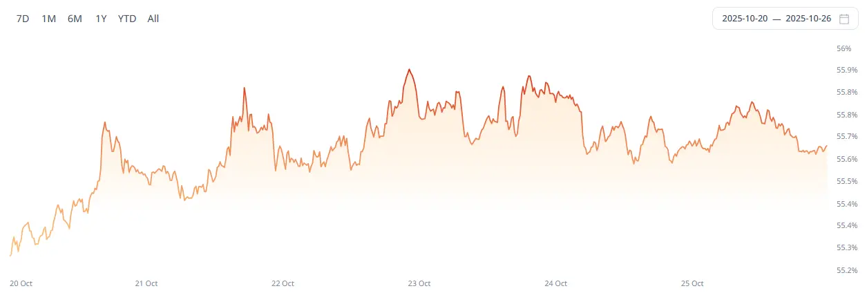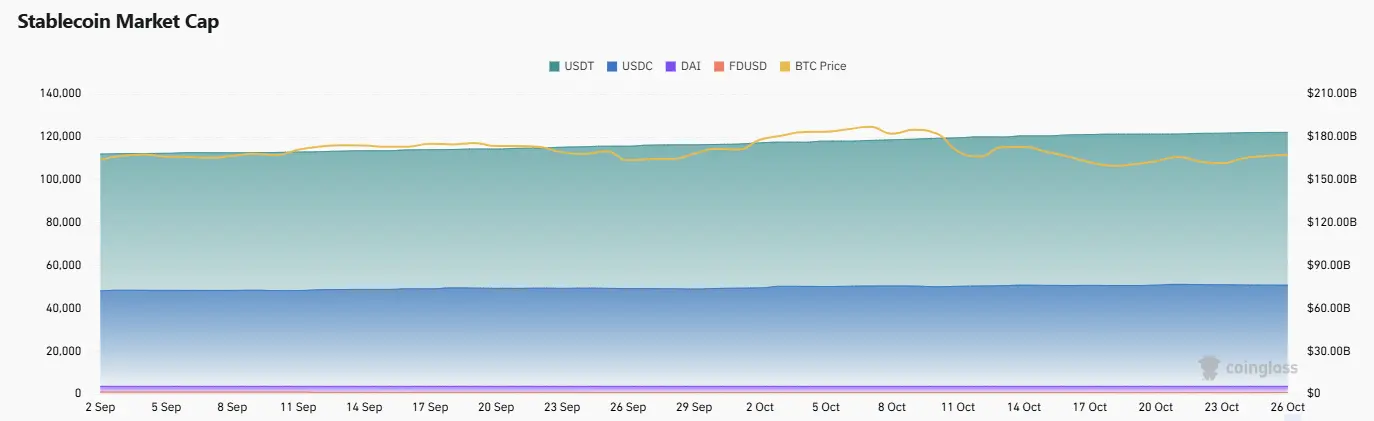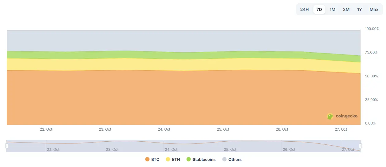 截止至发稿,比特币市值为2.29万亿美元,占加密货币总市值的57.62%。与此同时,稳定币市值为3,120亿美元,占加密货币总市值的7.87%。