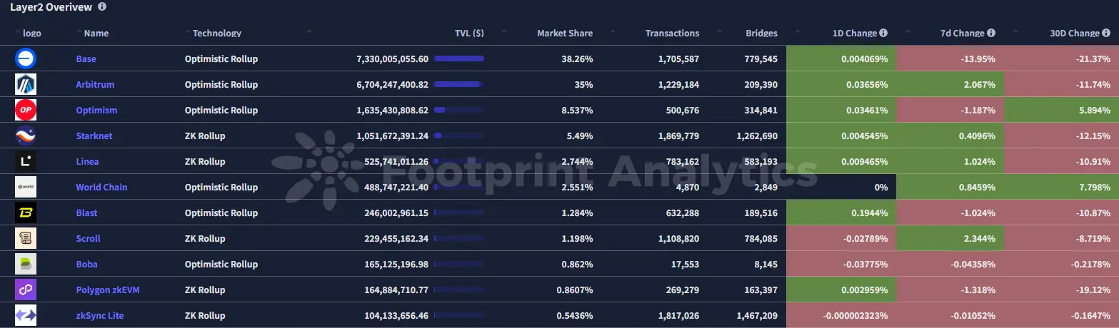 - Base和Arbitrum分别以38.26% 和35% 的市场份额占据前排,本周Base依然在以太坊Layer2的TVL中位居第一。