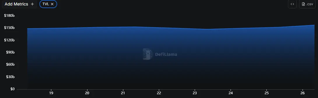 据DeFiLlama的数据,本周DeFi总TVL为1,575亿美元,较上周1,522亿美元,本周涨幅为3.48%。