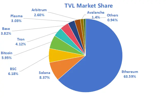 按公链进行划分,其中TVL最高的三条公链分别是Ethereum链占比63.59%;Solana链占比8.37%;BNBChain占比6.18%。