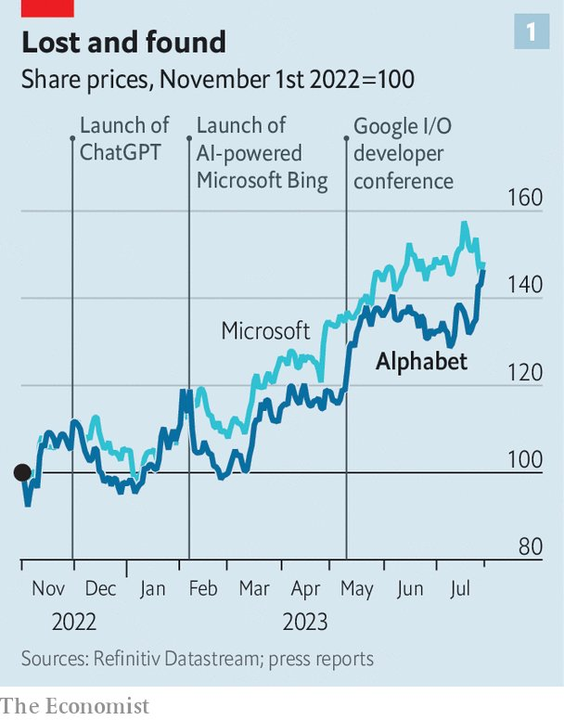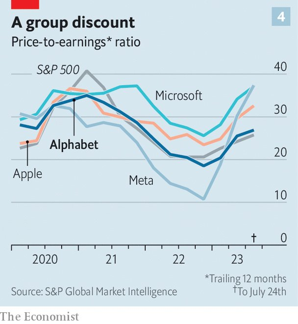 此外,Alphabet 还希望成为基于云的 AI 商业软件领域的一支生力军,将四分之三的资本支出都用于建设和装备新的数据中心。为了赶上亚马逊云服务(AWS)和微软 Azure,谷歌云在过去几年里为客户提供了减价优惠,随之销售额以每年 40% 的速度增长。在过去的两个季度里,该部门首次实现盈利(尽管部分原因是会计变更)。但这是一项周期性业务,而且竞争激烈。微软没有公开其 Azure 的业绩,但 AWS 已披露的营业利润率一直在稳步下降,从几年前的 30% 或更高降至目前的 24%。