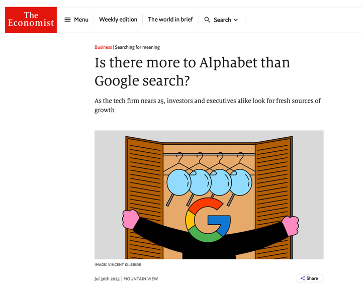 一个更深层次的问题是,任何新企业都很难有所作为。只有少数几个行业 —— 比如金融、政府、医疗保健 —— 规模大且不受干扰,足以对 Alphabet 的业绩产生实质性影响。征服这些市场需要巨额投资,回报却不确定,而且没有一个行业能像搜索广告领域那样,为谷歌提供轻资本的准垄断地位。