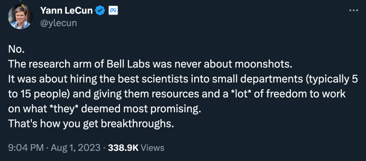 「不,贝尔实验室的研究部门从来都不是关于登月计划的。它会雇用最优秀的科学家组成小部门(通常是 5 到 15 人),并为他们提供资源和大量自由空间来从事他们认为最有前途的工作。这才是取得突破的方式。」