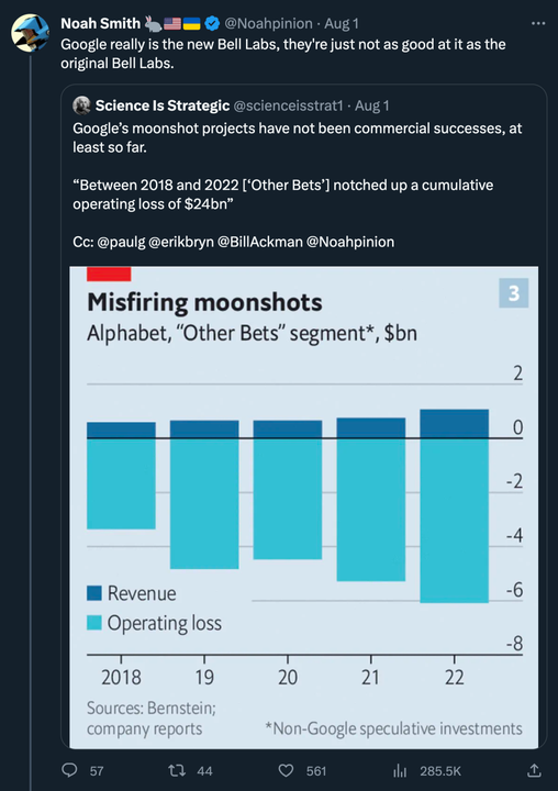 也有人将谷歌比作新的「贝尔实验室」,只是不如真正的贝尔实验室做得好: