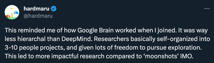 「这让我想起了我加入 Google Brain 时的工作方式。它比 DeepMind 的等级制度要少得多。研究人员基本上自行组织成 3-10 人的项目组,并给予很大的自由来进行探索。在我看来,与登月计划相比,这导致了更具影响力的研究。」