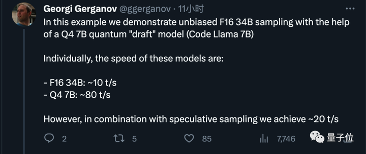 他使用4bit量化的7B模型作为“草稿”模型,每秒约能生成80个token。