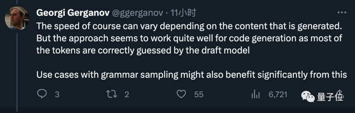他额外表示,速度可能会根据生成的内容而有所不同,但在代码生成上非常有效,草稿模型能猜对大多数token。