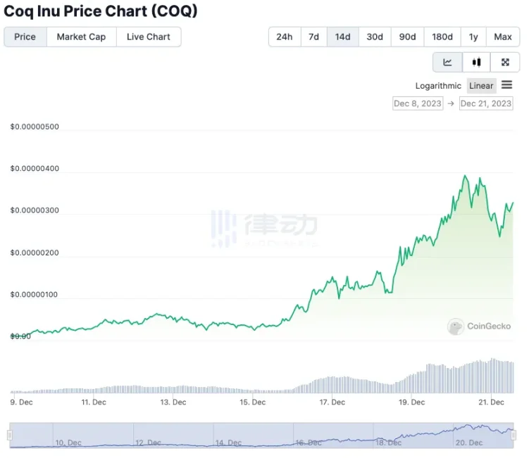 这两天,COQ 也显示出显著的增长趋势。根据 CoinGecko 的数据,COQ 在 12 月 18 日的 24 小时内首次涨幅达到 26.7%,报价为 0.00000178 美元。紧接着在同一天,其涨幅进一步扩大至 45.1%,价格上升到 0.00000196 美元。到了 12 月 19 日,COQ 的涨幅更是达到了 108.6%,报价升至 0.00000244 美元,表现出强劲的市场动态。