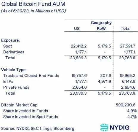 在美国现货 BTC ETF 出现前,BTC 的投资方式和产品结构包括信托(例如灰度比特币信托 GBTC)、BTC 期货 ETF、美国以外地区已经推出的现货 ETF(如在欧洲和加拿大)以及其他配置了 BTC 的私募基金等。仅 GBTC 的 AUM 就达到 234 亿美金,最大的 BTC 期货 ETF BITO AUM 13.7 亿美金,加拿大最大的现货 BTC ETF BTCC AUM 为 3.2 亿美金。其他私募的 BTC 配置情况并不透明,实际总量可能远大于 300 亿美元。