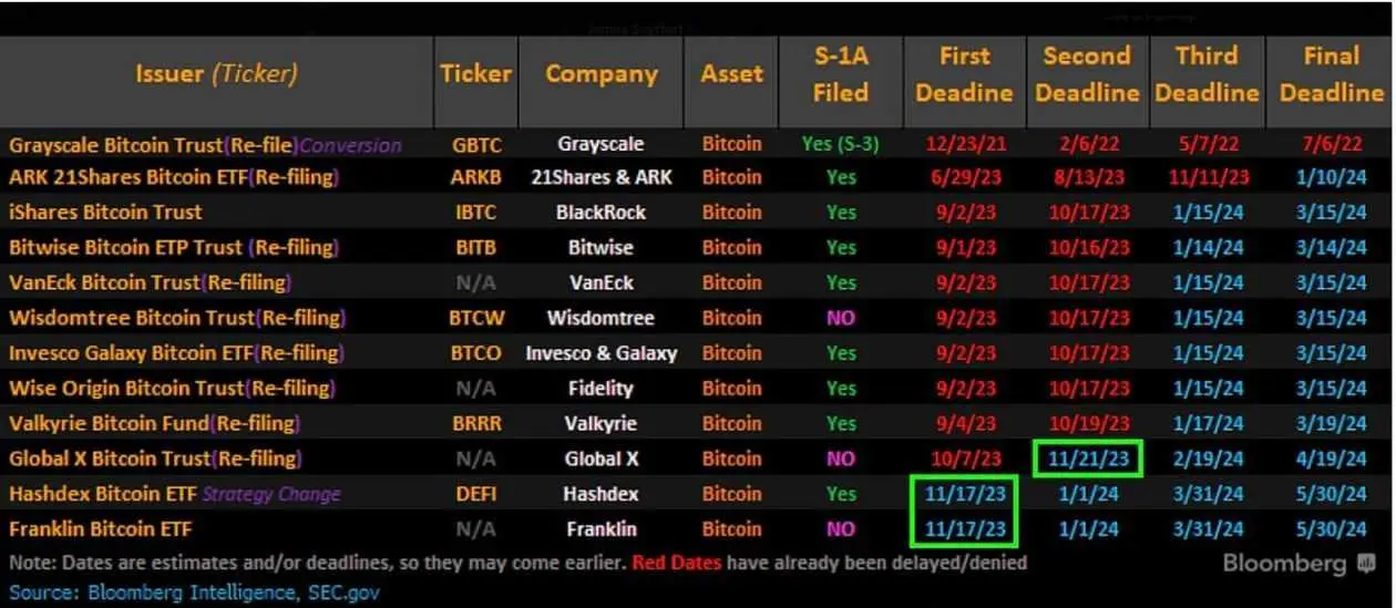 ETF 审批流程来看,最长时间为 240 天,SEC 必须作出终极批示,而 Ark&21 shares 作为申请最早的机构,其本轮申请 SEC 必须出示审批结果的截止日期为 2024 年 1 月 10 日。如果 ARK 被批准,那么大概率后续几家都会被批准。
