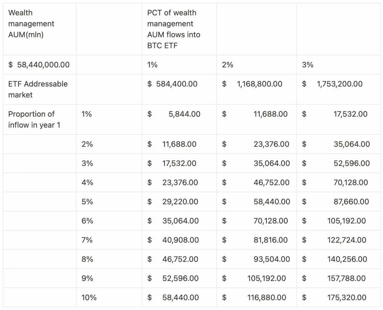 通过非常保守的类别黄金和使用 58440bln 的财富管理 AUM 中的 1% 流入 BTC 的方法进行估计,预计 BTC 现货 ETF 通过后第一年流入资金在为 54 亿 -290 亿美元左右。