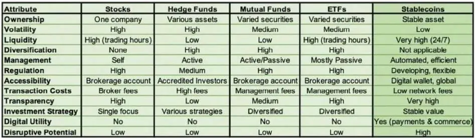 Gurbacs 认为,稳定币具有独特的特性,使其有别于股票、对冲基金、共同基金和交易所交易基金等传统金融工具。这些特性包括费用低廉、易于获取和商业实用性,使稳定币不仅仅是一种数字资产,而是未来全球金融的关键角色。