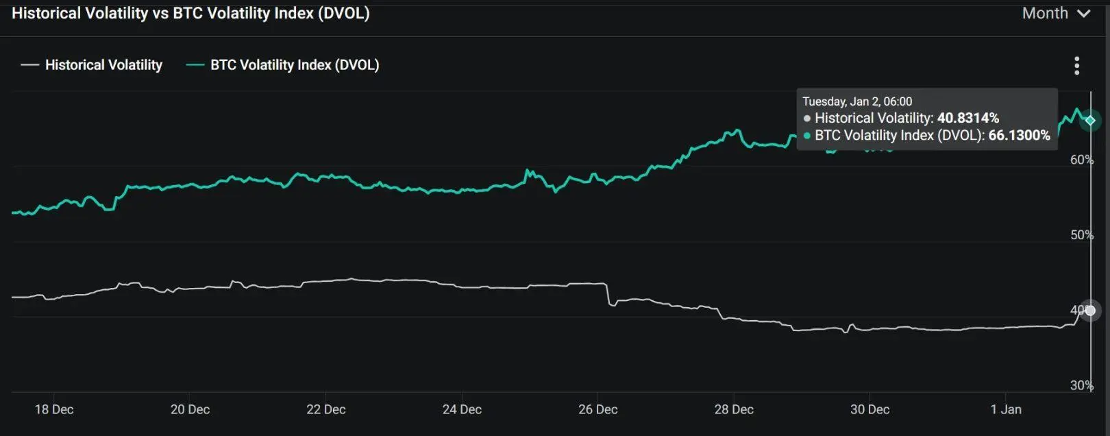 此外值得注意的是,Derbit 的 BTC 波动指数(DVOL)相比往年也逆势上涨,近 7 日来更是从 44% 左右上涨 50%,达到 66% 附近——往年该时间段 DVOL 一直是稳步下降趋势,徘徊在 40% 区间。