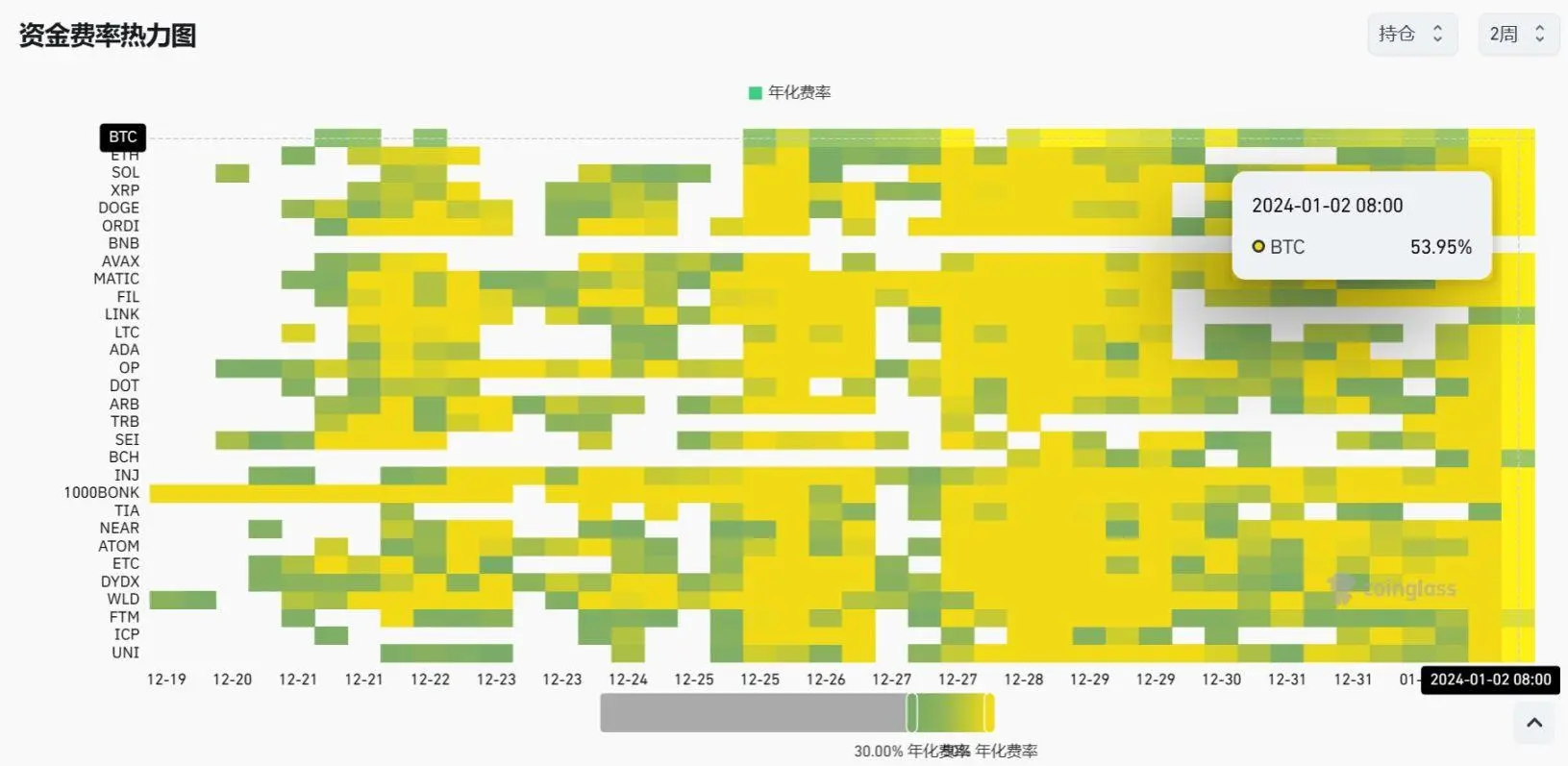 与此同时,Coinglass 数据显示,BTC 和 ETH 的永续合约资金费率从 12 月 25 日开始,已连续一周处于年化 30% 以上水平——多头头寸持续支出相当于年化 30% 的巨额资金费,对行情突破上涨的未来预判较为坚定。