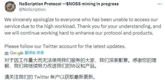 由于没有铸造成本(无需支付 Gas),且基于闪电网络,不少社区成员批量上号参与铸造。NOSS 首次铸造当天,流量过高导致官网就直接瘫痪,项目方被迫暂停公开铸造,并告知参与铸造者需要耐心等待重新铸造的时间。