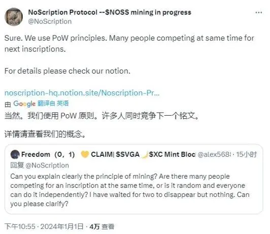 一瞬间,各个铭文社区炸开了锅,该条推文的底下更是「骂声一片」。有社区成员反馈,NOSS 项目方用铸造用户的算力来为自己挖 BTC(下图 1)。