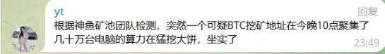 此外,也有社区成员反馈,昨晚 10 点左右确实突然有一个未知矿池比特币算力暴涨(下图 2)。