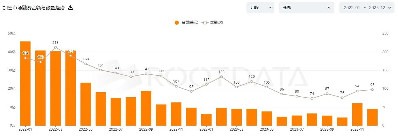 12 月加密货币领域的融资总金额为 9.09 亿美元,同比下降 6.5%,融资数量为 98 笔,同比增长 5.3%。