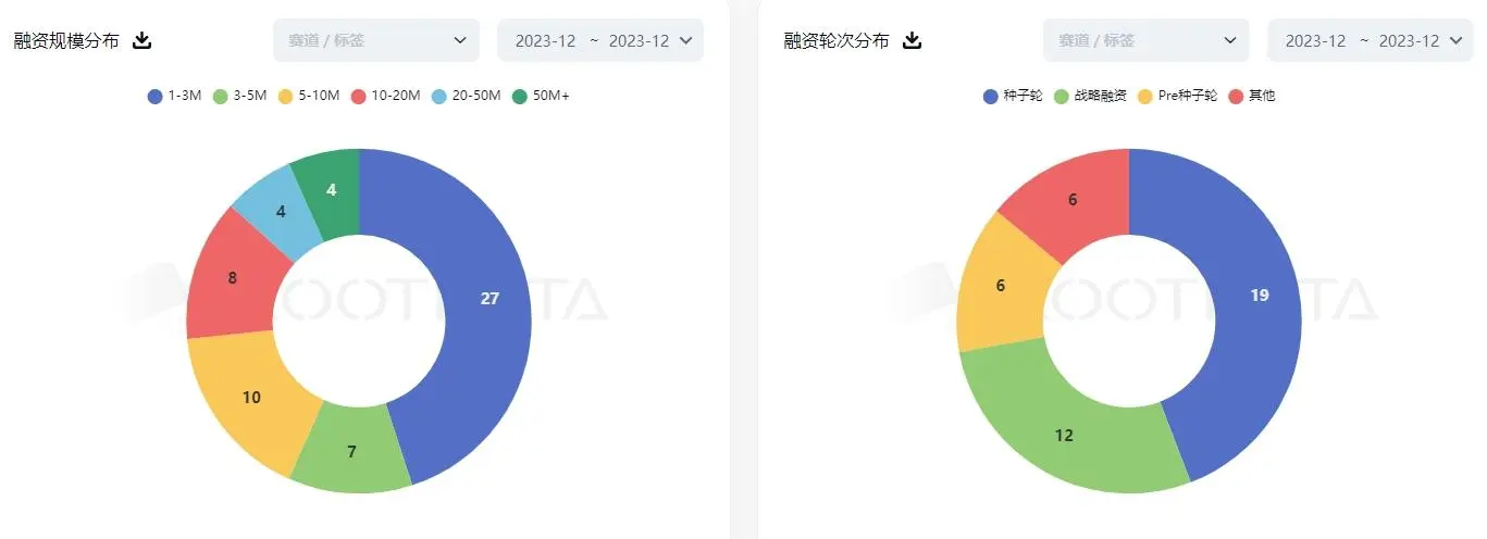 种子轮仍然是最热门的融资轮次, 12 月有 19 个项目完成种子轮融资,占比达 44.19%,环比稍有下降。