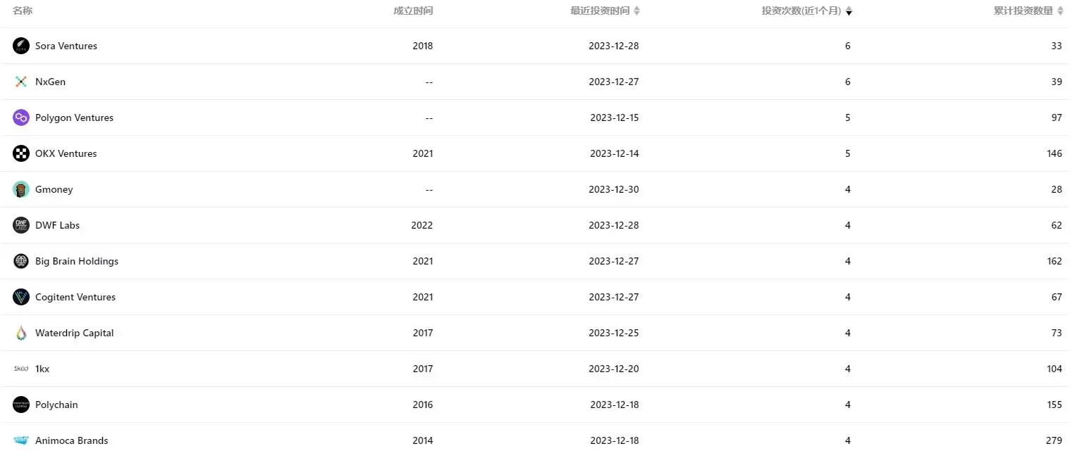 12 月份,加密机构的投资活动明显增加,共有 12 家投资机构的出手次数超过 4 次,而上个月仅有 5 家机构达到这一频次。其中,Sora Ventures 和 NxGen 表现最为突出,出手次数达到 6 次。