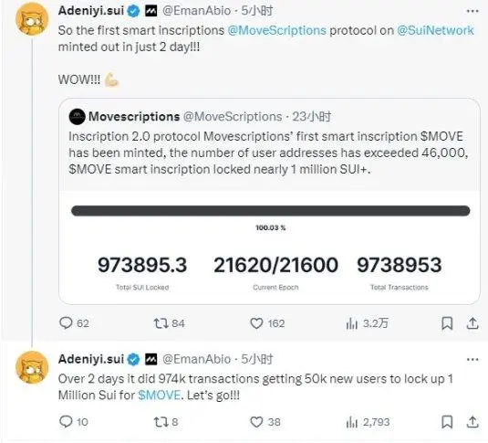 二是得到 Mysten Labs 联合创始人的支持。今天 Mysten Labs 联合创始人提及 MOVE 并称其为 Sui 生态上第一个智能铭文项目,增加了官方推特提及 MOVE 铭文的可能性。