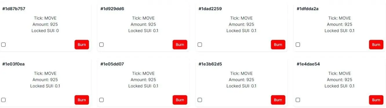 下图为狂暴加速模式下铸造出的 MOVE。首先,在狂暴加速模式下为 500 个参与地址平分 46 万枚 MOVE。因此,平均每个地址会分到 925 枚。其次,图中第一个「Locked SUI = 0」铭文,即为一轮 epoch 中的中奖地址获得的铭文;其他「Locked SUI = 0.1」,即为正常参与铸造锁仓 0.1 SUI 的铭文。最后,每个铭文右下方均有一个「Burn」功能,点击 Burn 按钮即可燃烧该铭文并取回锁仓的 0.1 SUI。据多名参与者反馈,Burn 功能确实有效,锁仓的 0.1 SUI 会即刻返还。