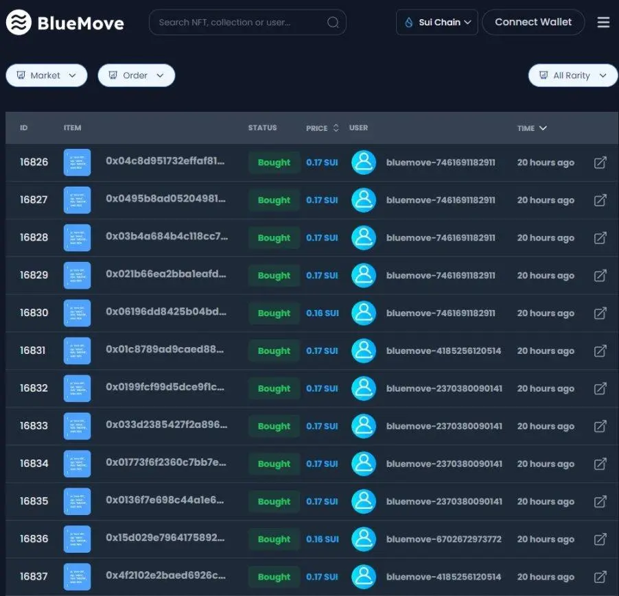 值得一提的是,昨晚在一个 NFT 平台 BlueMove 中可以进行 MOVE 交易,其中数量为 925 枚的 MOVE 成交价格区间在 0.17-0.2 SUI(如下图)。但由于该合集混杂了其他项目,在此平台交易时注意区分。关于其他 OTC 交易情况,成交价格区间大体也在 0.17-0.2 SUI。